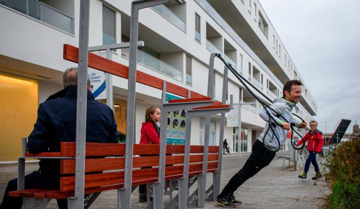 18 IPitup-beweegbanken vormen samen een beweeglint. Je kan van de ene naar de andere bank wandelen, lopen of fietsen.