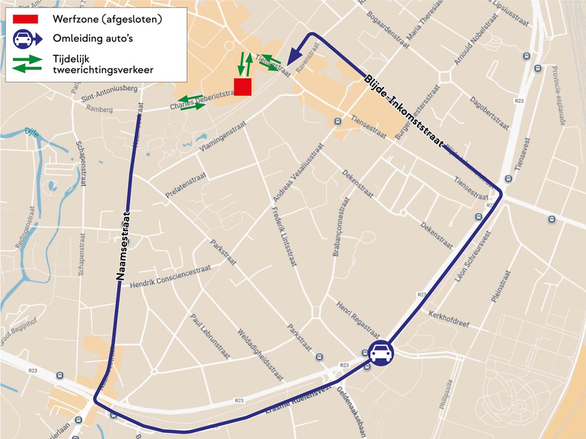 - Je volgt een omleiding via de Naamsestraat, Erasme Ruelensvest, Geldenaaksevest, Blijde-Inkomststraat en het Herbert Hooverplein.
