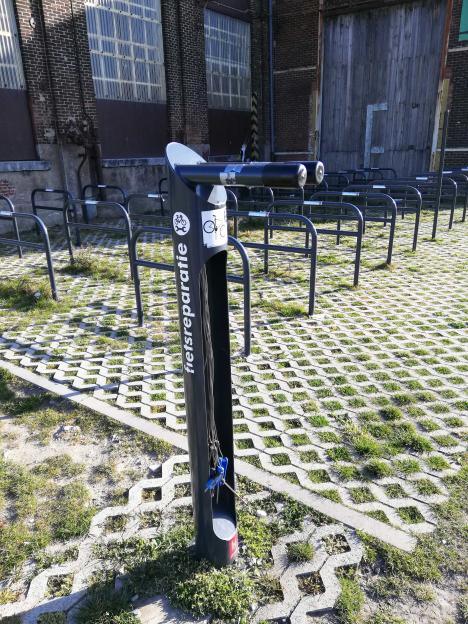 Een fietsherstelzuil is een constructie waaraan je je fiets kan ophangen om kleine herstellingen te doen.
