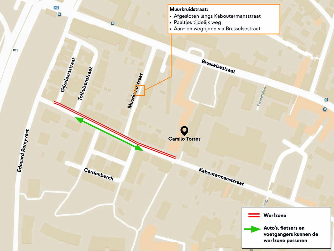 - We halen de paaltjes in de Muurkruidstraat tijdelijk weg. Je rijdt in en uit langs de Brusselsestraat.