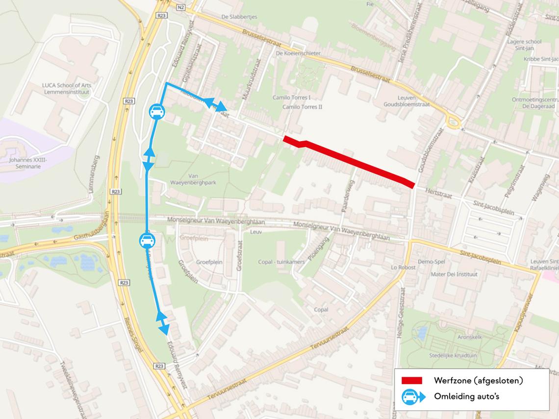 - Het deel van de straat waar geen werken zijn, blijft bereikbaar via de Edouard Remyvest.