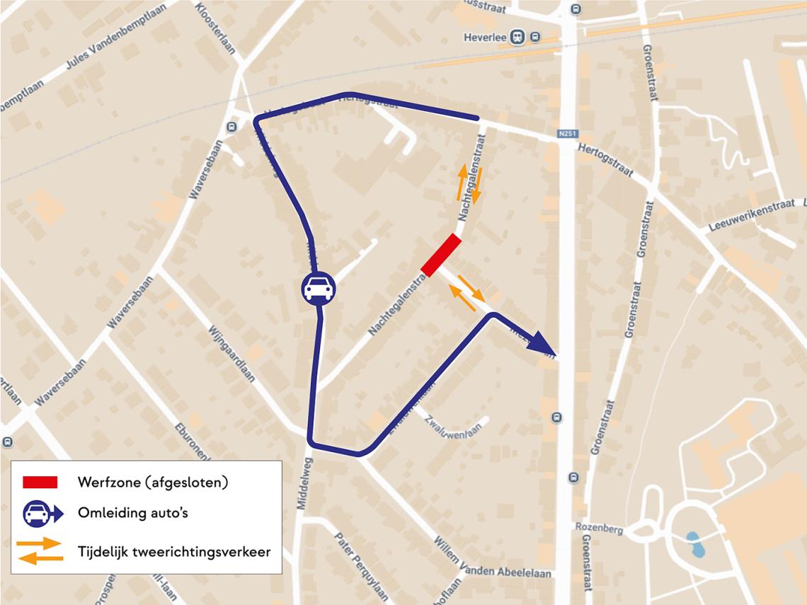 - Je volgt een omleiding via de Hertogstraat, Middelweg, Zwaluwenlaan, Mezenlaan en Naamsesteenweg.