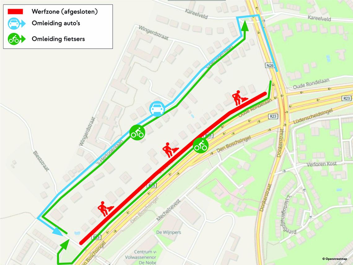 - De Oude Rondelaan is afgesloten tussen de Wijnpersstraat en de Nieuwe Mechelsesteenweg.