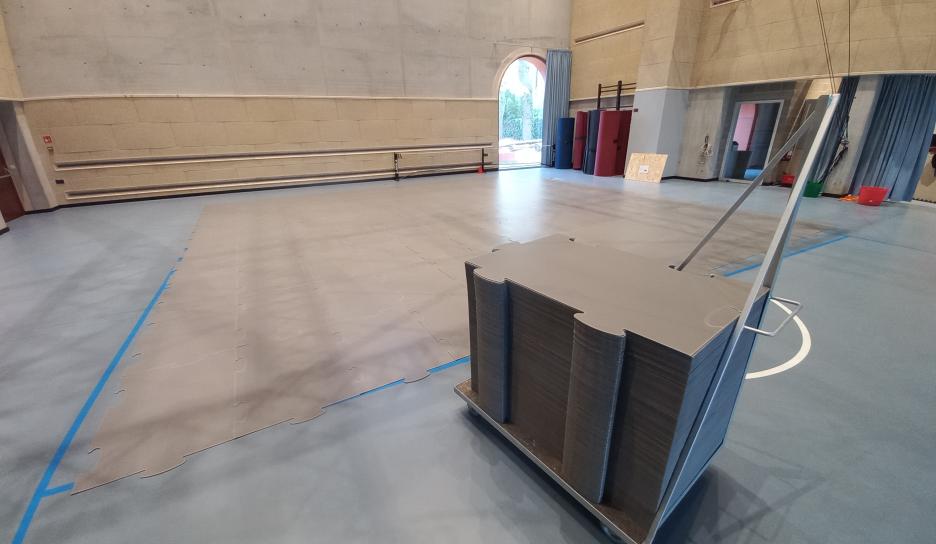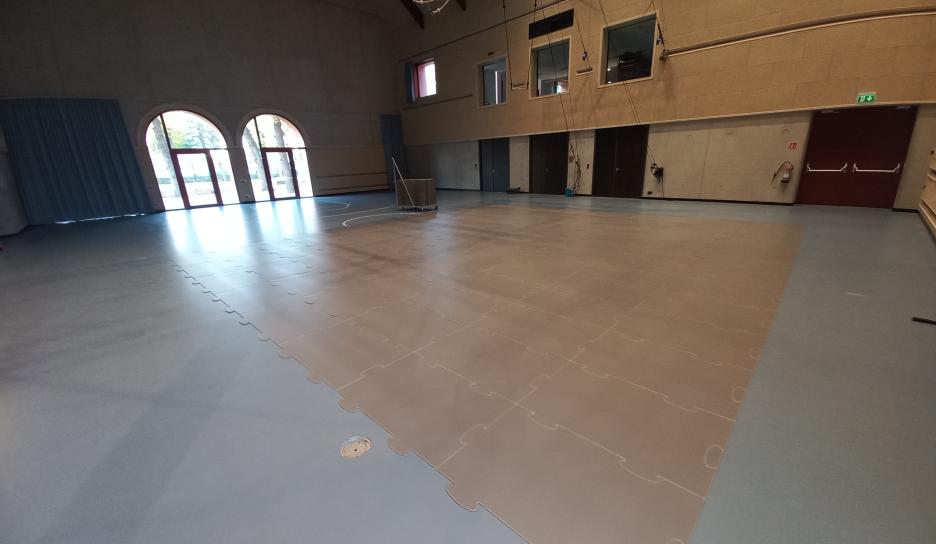 Dan vragen we om eerst de vloer te beschermen door een beschermvloer te leggen. Reken ongeveer 30 minuten om die met 2 personen in een halve zaal te leggen en ongeveer 10 minuten om weer op te bergen. Je maakt de vloer zelf schoon voor je hem opbergt.