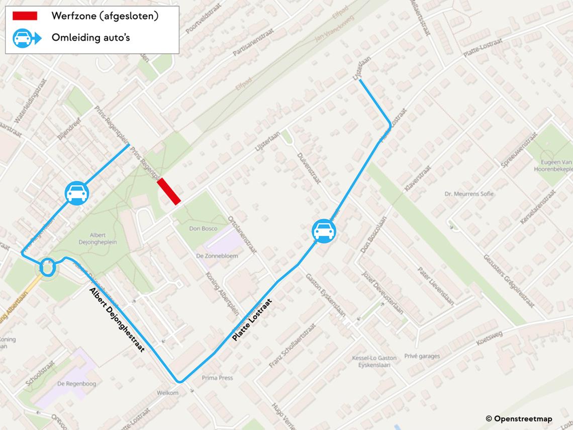 - Je volgt een omleiding via de Prins-Regentlaan, Willem Coosemansstraat, Albert Dejonghestraat, Platte Lostraat, Distelvinkenstraat en de Lijsterlaan.
