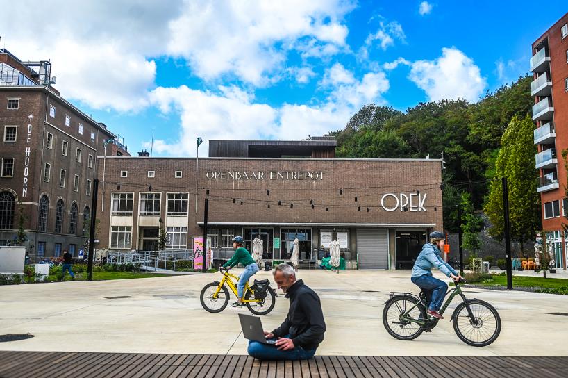 - Langs de gevels zijn er fietsenstallingen en gezellige terrassen.
