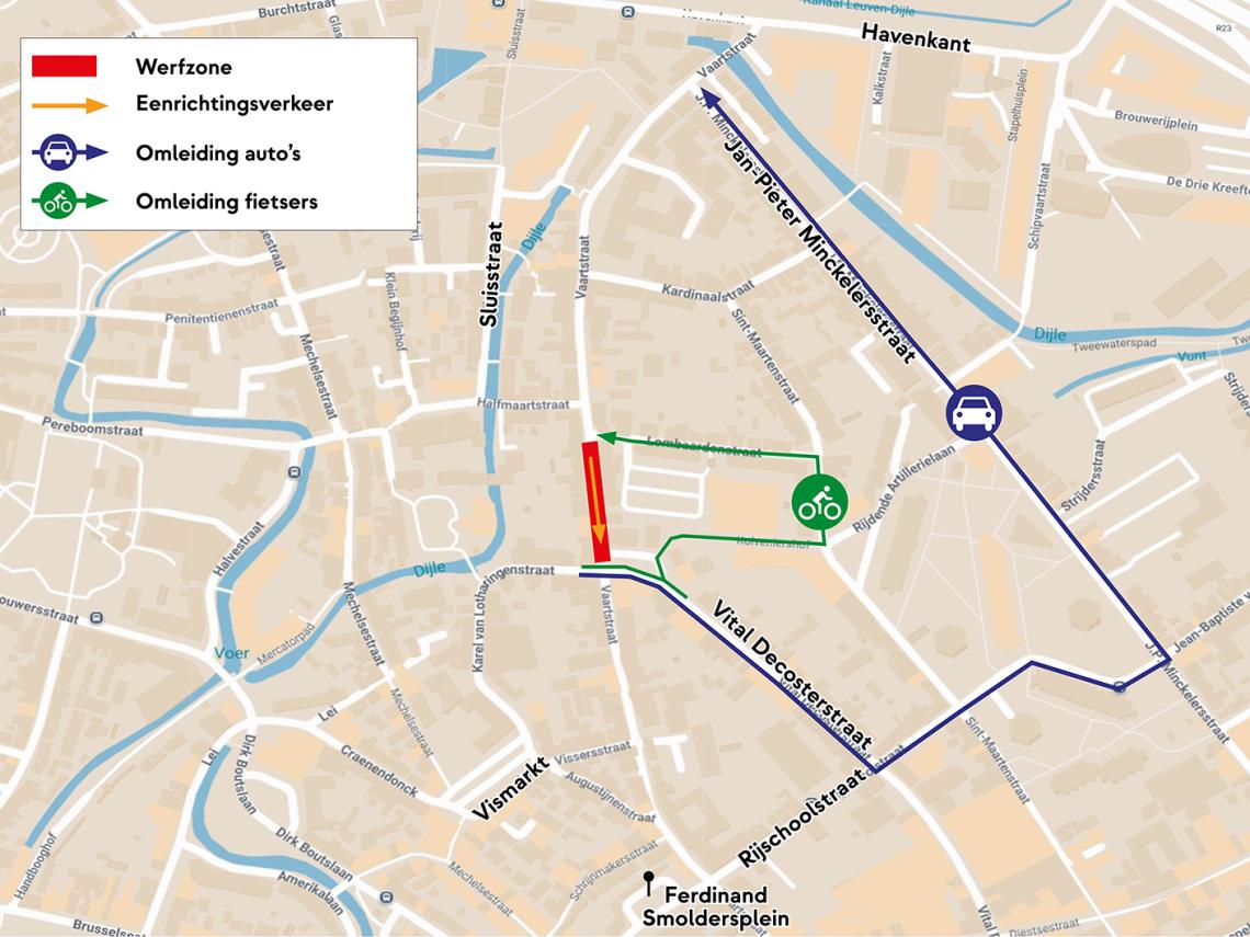 - Auto's in de andere richting volgen een omleiding via de Vital Decosterstraat, Mathias Van den Gheynlaan en Jan-Pieter Minckelersstraat.