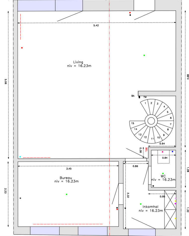 - Gelijkvloers met een vloeroppervlakte van 81 m² (inkomhal, wc, bureauruimte, living, keuken met berging en terras)