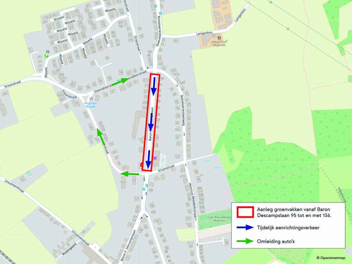 - De Baron Descampslaan tussen de Kroonstraat en de Steenakkerstraat.