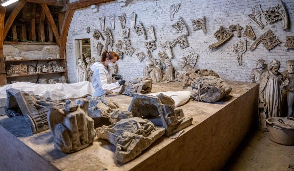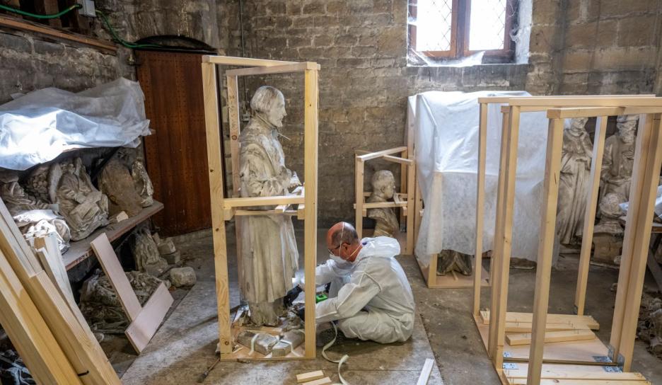 - Een groot aantal gevelbeelden zijn op de zolder van het stadhuis al ingepakt en gereinigd, onder begeleiding van M Leuven.