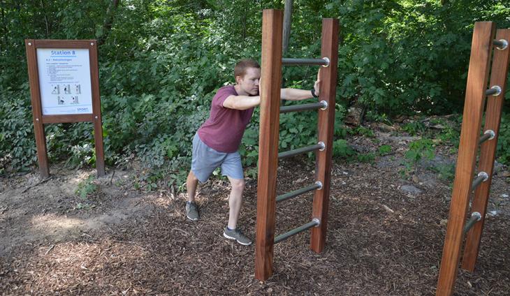 Parcours van 2,2 km door Heverleebos, met onderweg 8 plekken met oefeningen.