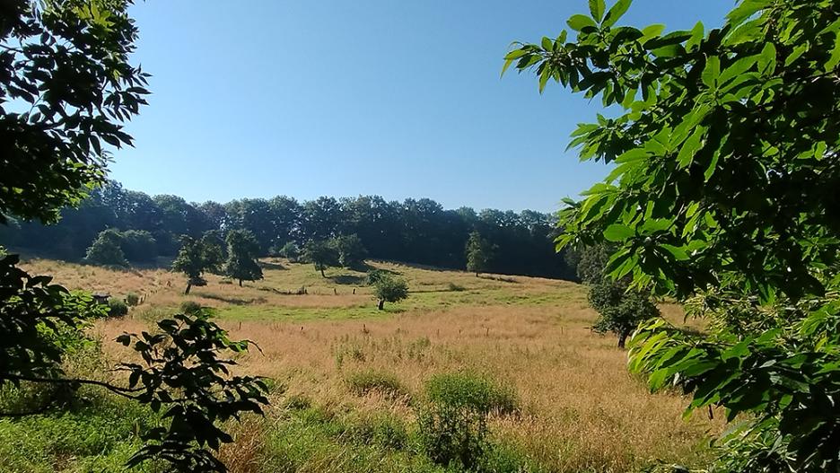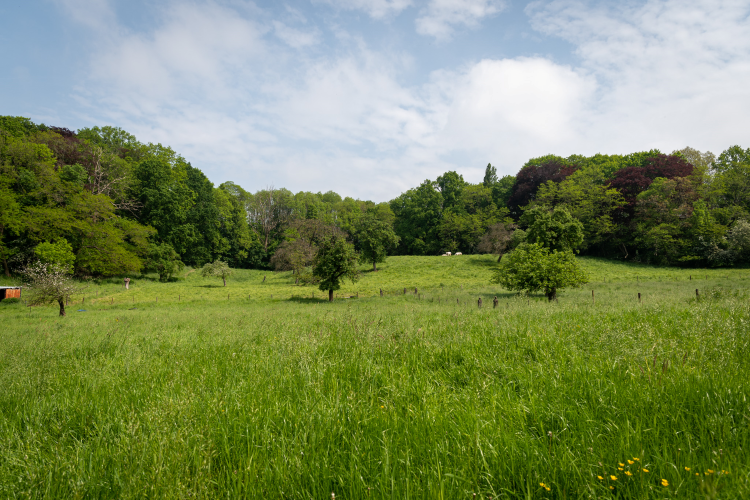 - Het park is begrensd door bomen. Centraal vind je ook weides en een boomgaard.