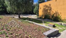 At the Banacha location in Krakow, a comprehensive naturebased stormwater management system was implemented through the construction of a specialized rain garden. This facility features a strategically designed basin that captures and infiltrates runoff from hardened surfaces and vegetated areas. The basin bottom was partially sealed to prevent soil plasticization and control overflow beyond its perimeter.
