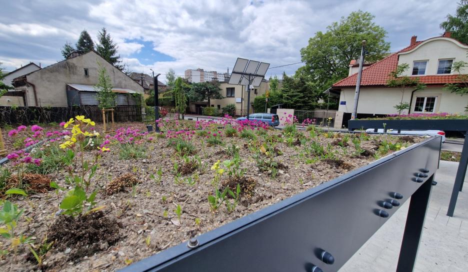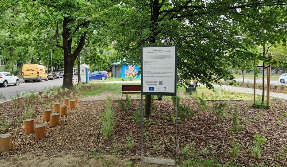 The LIFE-PACT project implemented a comprehensive bluegreen climate adaptation solution on Monte Cassino Street in Krakow. The investment comprises three functional zones: a green wall serving as an acoustic barrier, a recreation zone with benches and recreational infrastructure, and a rain garden collecting stormwater.