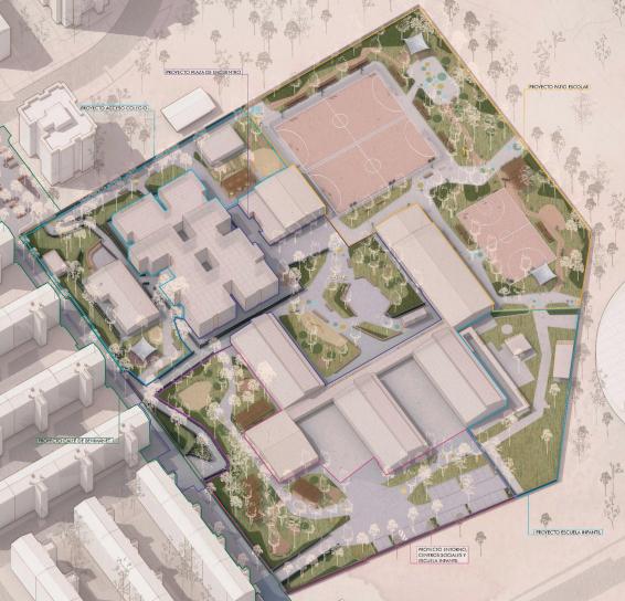 Navas de Tolosa School is the pilot project of an ambitious transformation aimed at reconnecting school spaces with their natural environment, enhancing climate comfort and fostering a closer relationship with nature. The interventions, developed in collaboration with the school community and municipal technicians, are intended to create a lasting impact on the well-being of students and the neighbourhood.