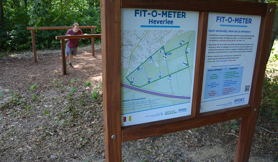 Een fit-o-meter is een parcours met onderweg sportoefeningen voor lenigheid, coördinatie, kracht of evenwicht. In Heverleebos vind je zo'n parcours met 8 oefenstations.
