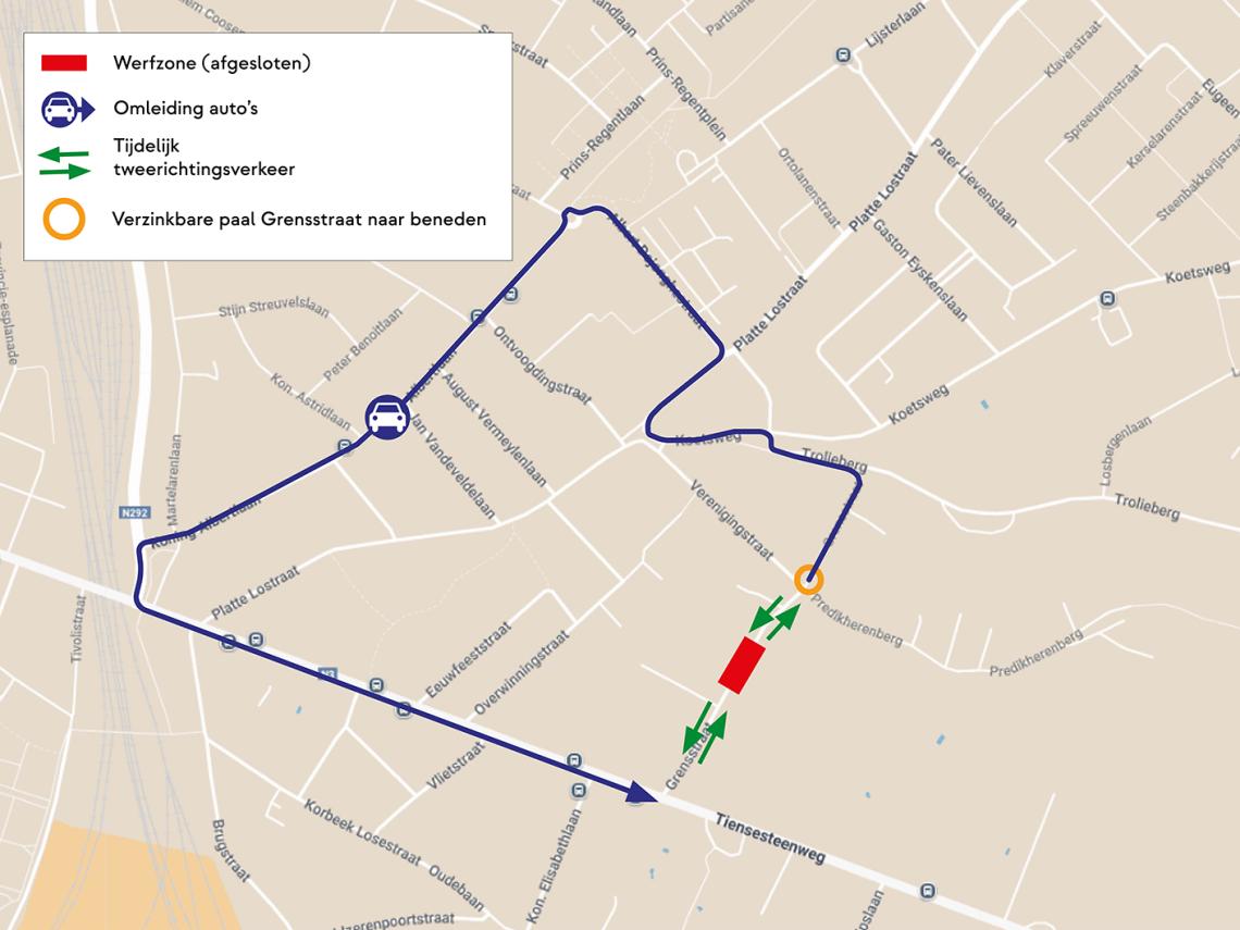 - Je volgt een omleiding via de Grensstraat, Trolieberg, Koetsweg, Platte Lostraat, Albert Dejonghestraat, Koning Albertlaan, Spoordijk en Tiensesteenweg.