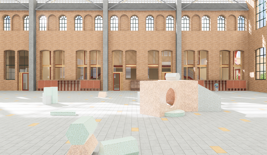 • In het midden van de hal komt een grote, verwarmde box. Daarin komen het onthaal, een polyvalente zaal, vergaderzalen, workshopruimtes en kantoren voor de jeugddienst van de stad.
