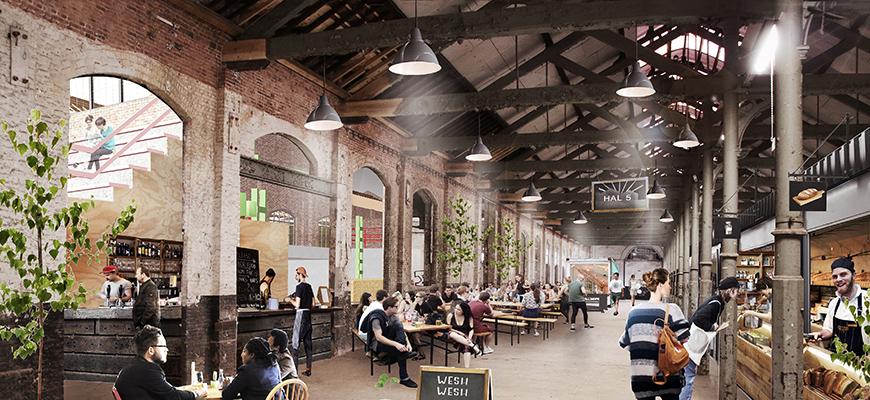 Een grote hal met binnenplein voor voeding en duurzaam ondernemen