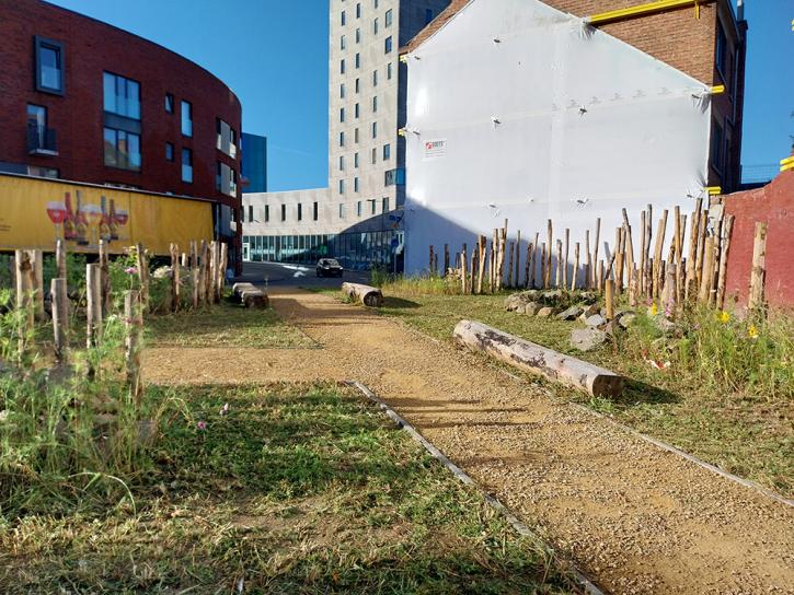 De locatie is tijdelijk heringericht met een waterdoorlatend pad, een zitbank, enkele meerstammige berken en heesters, en een tijdelijke bloemenweide.