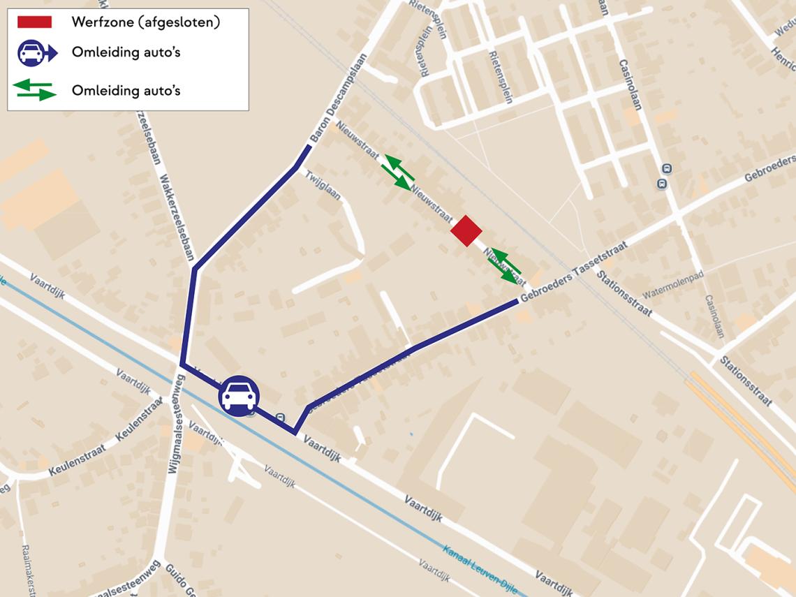 - Je volgt een omleiding via de Baron Descampslaan, Vaartdijk en Gebroeders Tassetstraat.
