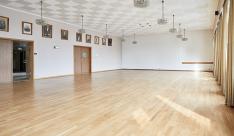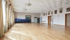 Door de gevoelige parketvloer mag je niet eten of drinken in deze zaal (alleen water mag).