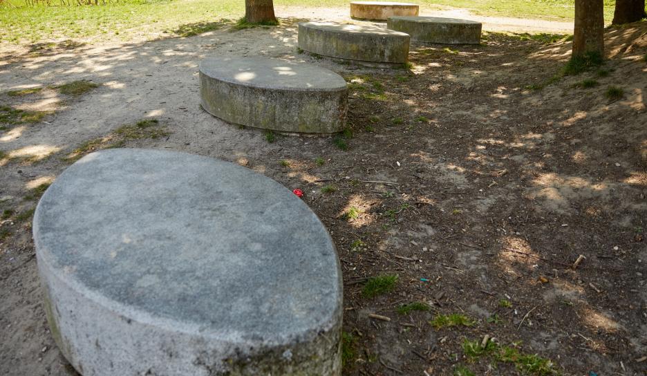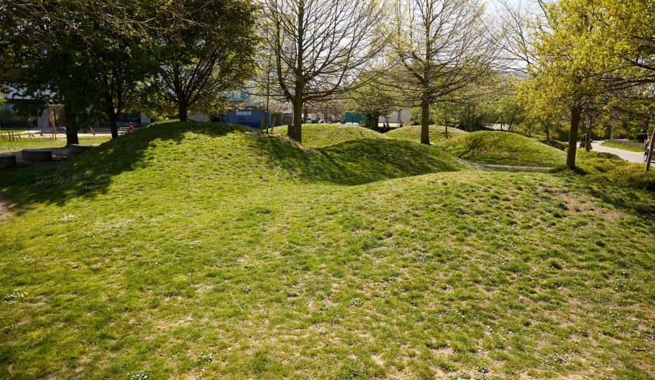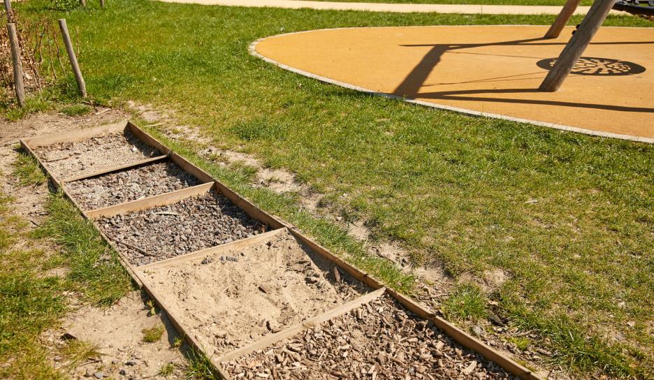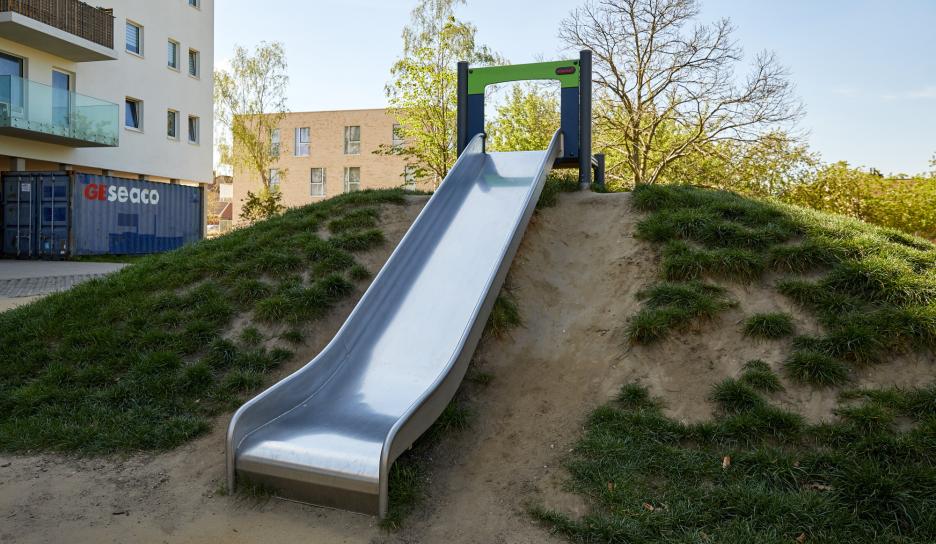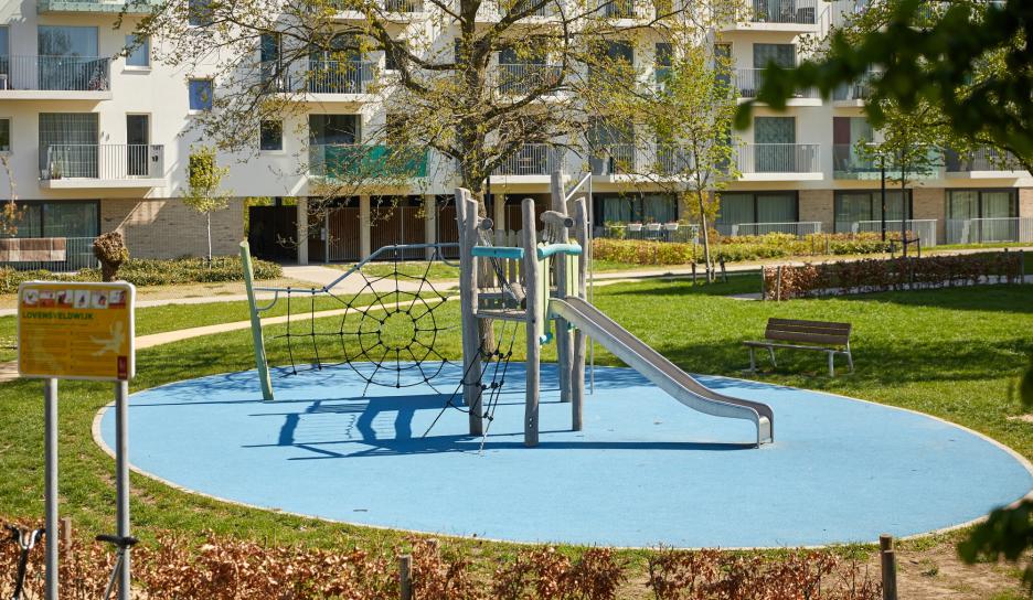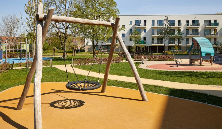 Bijna alle speeltoestellen staan op een vlakke ondergrond, waardoor je er goed over kan rijden, bv. ook voor ouders in een rolstoel.