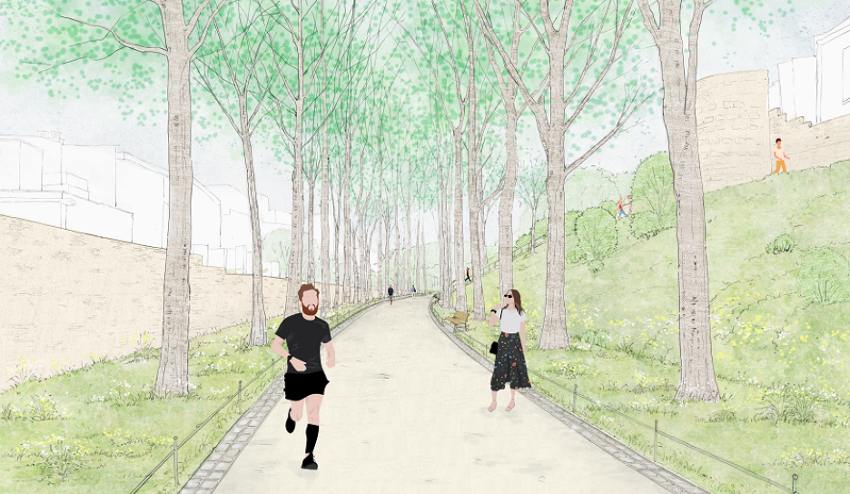 - Er komt een trap vanaf de dreef naar de hoger gelegen stadsomwalling