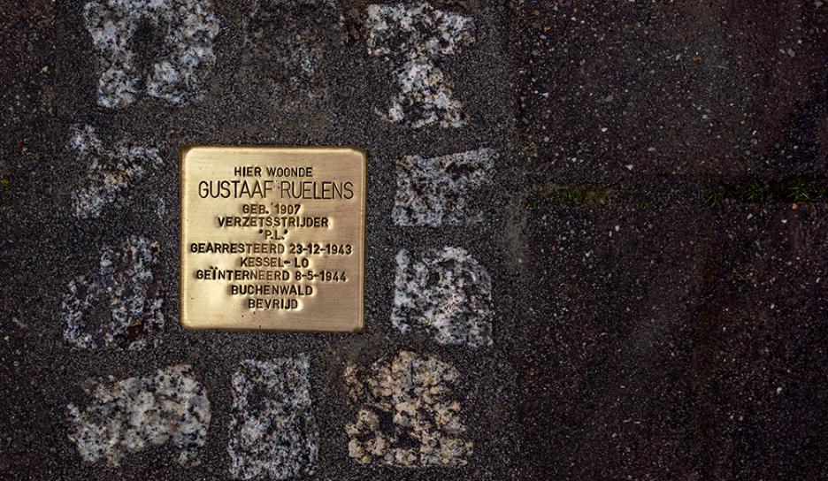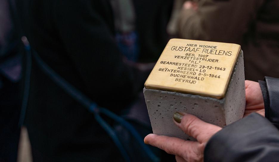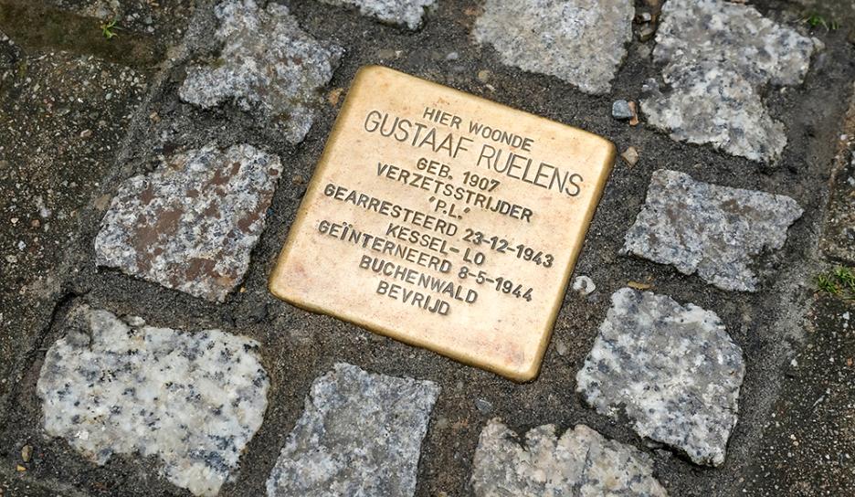 Je kan bij de stad toestemming vragen om een struikelsteen te plaatsen. Dat is een steen waarmee we een slachtoffer van het naziregime tijdens de Tweede Wereldoorlog herdenken. We plaatsen de kasseivormige steen in het voetpad, op een plek waar het slachtoffer woonde.