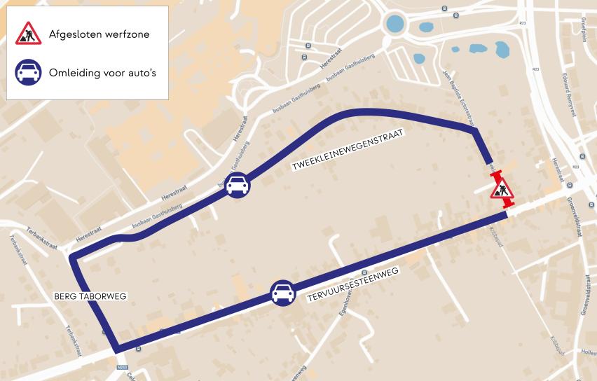 - Auto’s volgen een omleiding via de Tervuursesteenweg, Berg Taborweg en de Tweekleinewegenstraat.