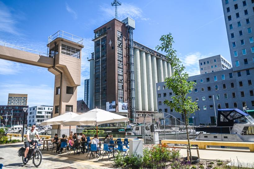 - Langs de gevels zijn er fietsenstallingen en gezellige terrassen.